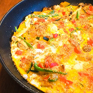 - (2)に卵を流し込み、パプリカ、しょうゆゴマ、パルメザンチーズを全体に散らし全体に火が通るまで中火で焼き上げる。