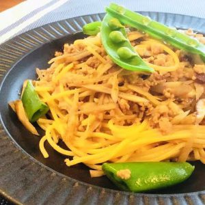スナップエンドウも同じ鍋で茹で、早めに取り出しておく。 - フライパンに桑名のこめ油を加えて弱火でニンニクと柚子ごしょうを炒め、香りが出て来たら鶏ひき肉、ごぼう、生しいたけも加えて炒めて薄口醤油とみりんで調味する。