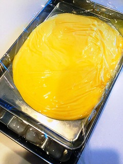 5. (4)をバットに広げて表面にラップをし、氷水にあてて粗熱を取り、粗熱が取れたら冷蔵庫で冷やして8等分する。